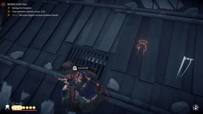 Поэтому бегите вокруг башни и следите за укрытием справа под вами. Благодаря сфокусированному слуху вы сразу увидите монгола, который занимается какой-то работой. Если вы также посмотрите влево на юго-восток, то сможете заметить там еще одного монгола. Как только он отвернется от вас, прыгайте на блиндаж и уничтожьте злодея путем убийства. Затем бросьтесь вправо к башне, поднимитесь по лестнице и убейте стрелка.