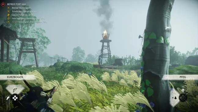 Всего в этой области Вы должны обнаружить семь врагов, один из которых находится на смотровой башне на дальнем востоке. Теперь можно было бы усердно стрелять по солдатам сверху из лука, но мы не советуем этого делать, так как стрелы лучше использовать в другой области.