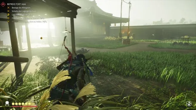 На этот раз начните с прохода между восточной и южной зоной: прямо перед ним растет пампасная трава, в которой вы сначала спрячетесь. Отсюда видна тренировочная площадка с несколькими мишенями по диагонали слева и здание по диагонали справа. На площадке монгол пропалывает землю, а перед зданием время от времени стоит солдат.
