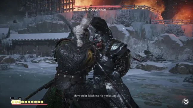 Ожидайте, что в любой момент сбоку на вас нападет новый монгол, одетый в красное. Он не особенно силен, но будет постоянно мешать вам. Поэтому всегда разбирайтесь с тем, кто хочет помешать, а затем снова сосредоточьтесь на самом хане. Продолжайте использовать боевую стойку ветра до тех пор, пока ваш противник не споткнется и не вызовет подкрепление во время короткой сцены.