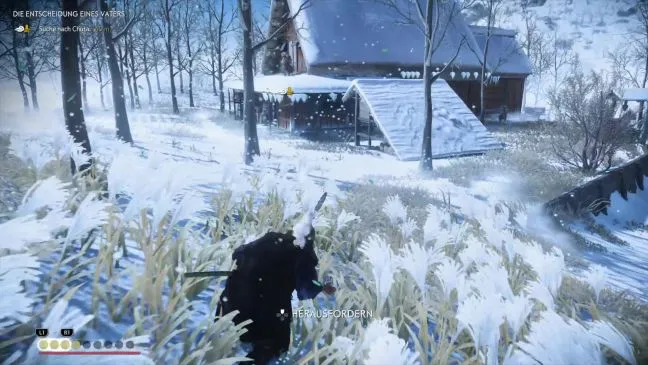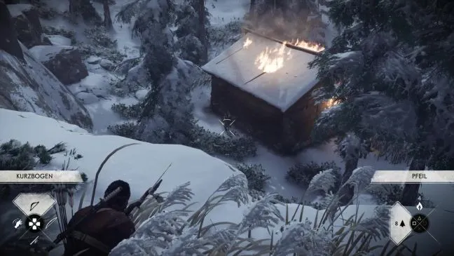 С другой стороны находятся пять монголов: двое на дороге и трое в заснеженном саду. Лучше всего прокрасться по широкой дуге к северо-восточной стороне участка и ударить сзади по ребятам на дороге. Затем снова спрячьтесь в пампасной траве и подойдите к оставшейся троице. И снова мы советуем использовать лук и стрелять в одного человека за другим.