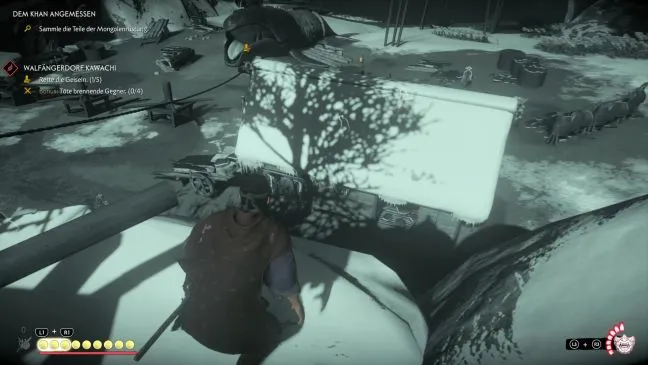 Двое из монголов остаются с заложником, а двое других стоят на страже в соседнем здании. Теперь бегите по широкой дуге к задней части этого здания и снова спрячьтесь в траве возле повозки. Теперь вы можете наблюдать за двумя солдатами на месте и заметить, что один из них находится внутри, а другой - снаружи, маршируя от одной стороны к другой. Вы можете скрытно уничтожить их одного за другим, но здесь очень важен момент.