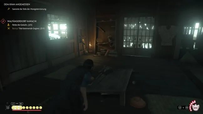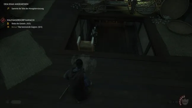Вы можете войти в здание через открытую дверь рядом с полкой и сразу же разобраться с двумя монголами. Один из них все время находится на первом этаже, а второй постоянно перебирается с этажа на этаж по лестнице. Поэтому укройтесь перед дверью и сосредоточенно наблюдайте за ним, пока он не поднимется на верхний этаж. Затем проследите за ним и зарежьте и его, и его коллегу на первом этаже.