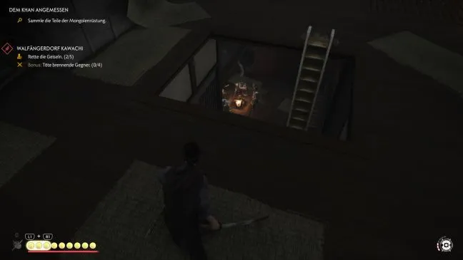 Теперь все становится немного сложнее, поскольку на первом этаже мальчики находятся очень близко друг к другу. Проверить их сверху можно, если подойти к лестнице, ведущей вниз, и встать перед проемом с другой стороны так, чтобы и лестница, и монголы были у вас на прицеле. Вы можете выстрелить в них из своего лука или бросить им под ноги бомбу с черным порохом. Еще лучше использовать стрелы с галлюцинациями, которые Вы получили от Юрико: с их помощью Вы можете подстрелить врагов между собой, а после бойни заняться выжившими и освободить заложника.