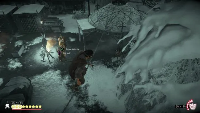 Поскольку с юго-западной стороны монголов почти нет, Вы легко подниметесь на только что расчищенную смотровую вышку и обнаружите под собой трех врагов: двух солдат и собаку. Лучше всего стрелять в животное, держа его как можно дальше от монголов, между белой палаткой и забором. Затем можно запрыгнуть на веревку и уничтожить злодеев цепной атакой, как только они окажутся рядом друг с другом перед костром.