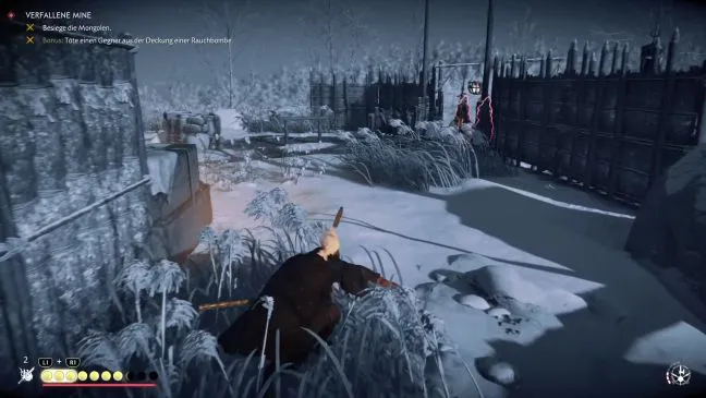 Если вам это удалось, сначала застрелите собаку за забором, а затем проберитесь к ящику перед забором. Вы можете использовать его как укрытие и в то же время наблюдать за двумя солдатами у костра. Снова подождите, пока они не окажутся рядом, и подкрадитесь к ним. Как только вы увидите их, вы должны немедленно (!) нажать кнопку для убийства цепью. Иначе они начнут сопротивляться и вызовут переполох.