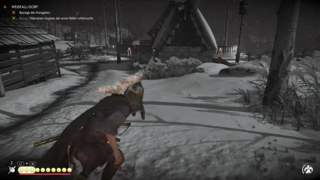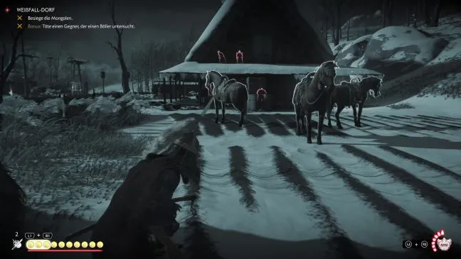Лучше всего подойти с востока и закрепиться в траве перед входом в деревню, чтобы можно было спокойно стрелять в стрелка на смотровой вышке. Теперь осторожно подойдите к входу и найдите прямо за ним справа костер. Рядом с ним находятся три монгола, один из которых время от времени подбегает к входу и поэтому особенно опасен. Поэтому следует быстро спрятаться в траве, растущей сразу за входом.