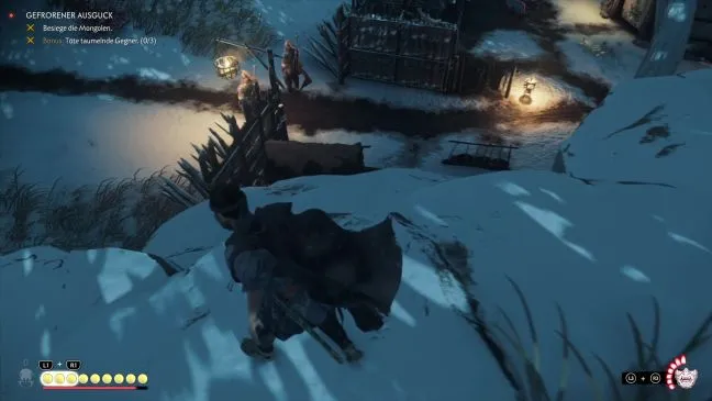 Замерзшая смотровая площадка состоит из трех уровней, которые можно проходить один за другим. Самым простым является верхний уровень, к которому вы подходите с северо-востока: Там стоит жалкий охранник, который смотрит на нижние уровни, и вы просто наносите ему удар в спину.