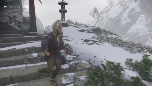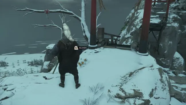 К святилищу нужно подойти с севера, чтобы попасть к входным воротам и лестнице, ведущей вниз. Она приведет вас к горящему мосту, где нужно обойти справа каменную лампу и подобрать на краю платформы немного припасов. В том же направлении можно перепрыгнуть на платформу с тисовым деревом и обойти ее слева до натянутой веревки. Перейдите по веревке на следующую скалу и, используя захватный крюк, доберитесь до пня.