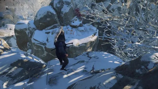 Затем снова поверните направо, перепрыгните еще через два провала и снова повисните на пне. Наконец, продолжая двигаться влево, поднимитесь по нескольким камням и перелезьте через последний пень, чтобы попасть на последние ступени, ведущие к святилищу и талисману Нигихаяхи-но-микото.