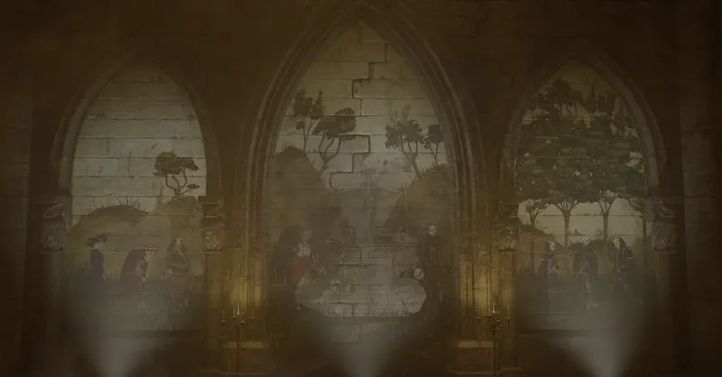 Теперь взаимодействуйте с лампой, и появится секретная лестница, по ступеням которой вы, конечно же, сразу спуститесь вниз. Только когда вы пересечете комнату внизу и дойдете до последнего кровавого следа перед фреской, вы сможете просканировать прожектор и, наконец, использовать его для создания следующего прохода. Для этого поверните четыре экспоната так, чтобы они проецировали тень атакующей совы.