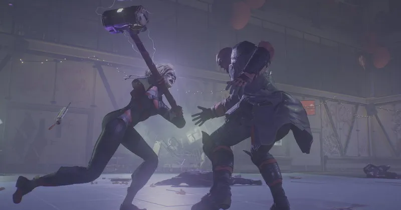 - Атакующее комбо: Харли замахивается на вас молотом, после чего следует прыжок в воздух и последующее повреждение области при ударе молотом о землю. За этим следует третья атака с замахом, от которой нужно уклониться, прежде чем парировать.