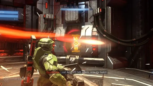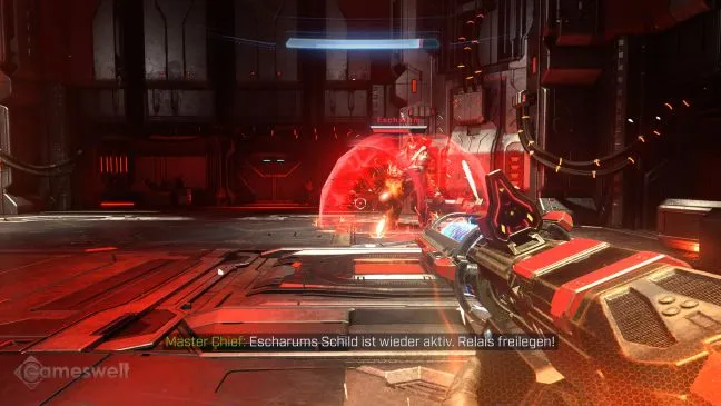 Когда реле будет уничтожено, можно снова наброситься на Эшарума (его голова по-прежнему остается самым слабым местом). Бросайте в него энергетические канистры, ищите базуку в боковых коридорах... делайте все, что можете, только не останавливайтесь! Все это дает свой эффект, но через некоторое время крип создает такой же защитный щит, как и раньше. Всего игра проходит четыре раза, поэтому четыре реле вскрываются одно за другим - всегда с небольшой задержкой, связанной с тем, что Weapon сканирует помещение. С каждым уничтоженным реле Эшарум становится все быстрее и агрессивнее. В последнем раунде он даже хватает большой топор и пытается одолеть вас в ближнем бою. Устройте ему ад!