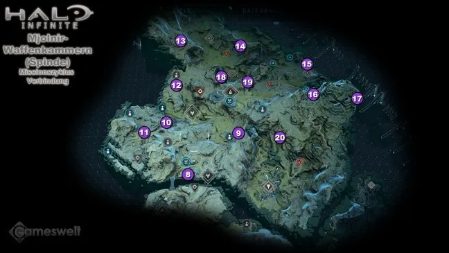 В этом цикле заданий вы возвращаетесь в зону, где впервые оказались на кольце, и можете забрать остальные 14 арсеналов, два из которых (с севера) у вас уже есть, если вы следовали нашему руководству. Остальные мы отсортировали в том порядке, в котором вы, скорее всего, их подберете, если будете следовать сюжетному маршруту. Поэтому мы перечислили два, расположенные рядом с местом раскопок, и последний сверху.