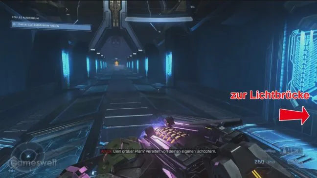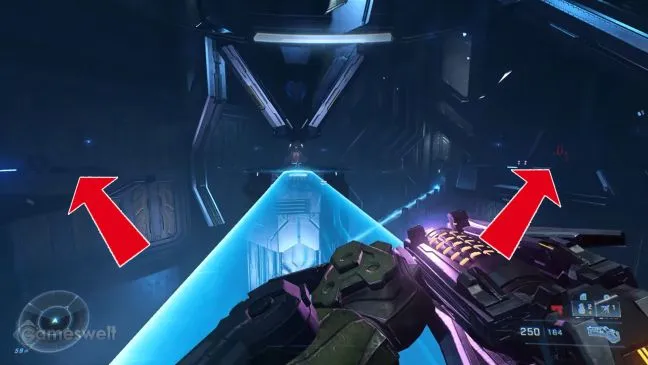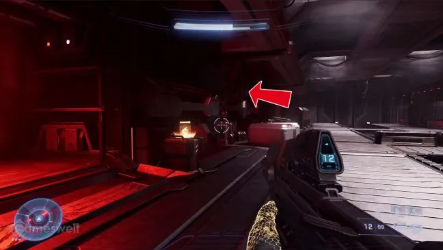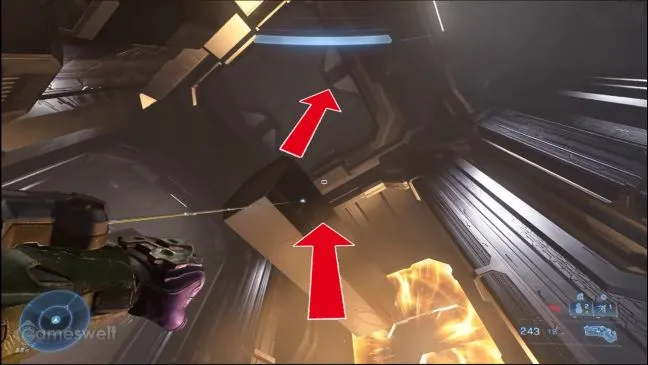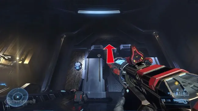 Вскоре после того, как вы заберете своего друга ИИ The Weapon, вы увидите в коридоре детские голограммы. Оттуда бегите по коридору, ведущему вверх, к другому коридору, который представляет собой Т-образный перекресток. Если вы продолжите движение влево, то вскоре доберетесь до металлической колонны. С помощью захватного крюка подтянитесь к этой опоре так, чтобы приземлиться в углублении. Держитесь в углублении вправо и подтянитесь к углублению следующей колонны, где лежит череп.