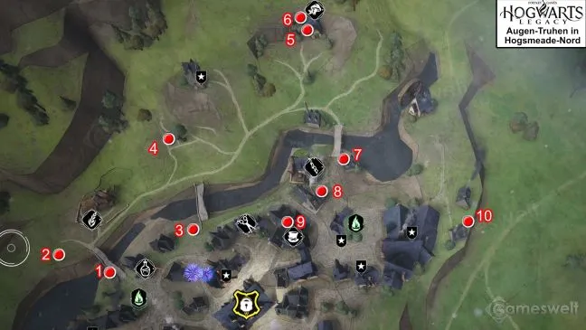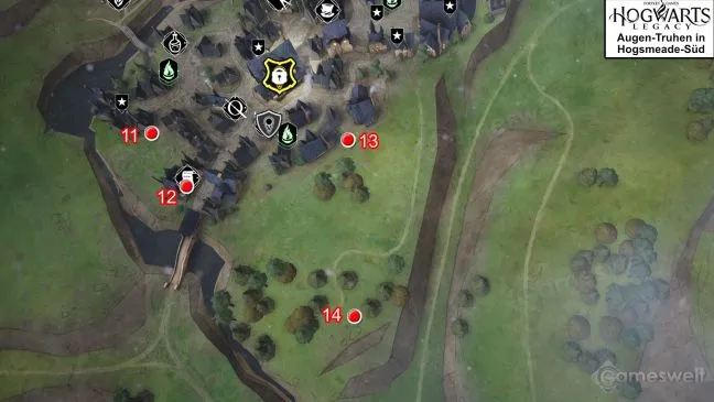 В городке Хогсмид, расположенном неподалеку от замка, вы также найдете несколько сундуков с глазами. Точнее, тринадцать. Мы покажем вам, где их искать. Помните, что открыть их можно только в том случае, если вы невидимы, иначе они закроются.