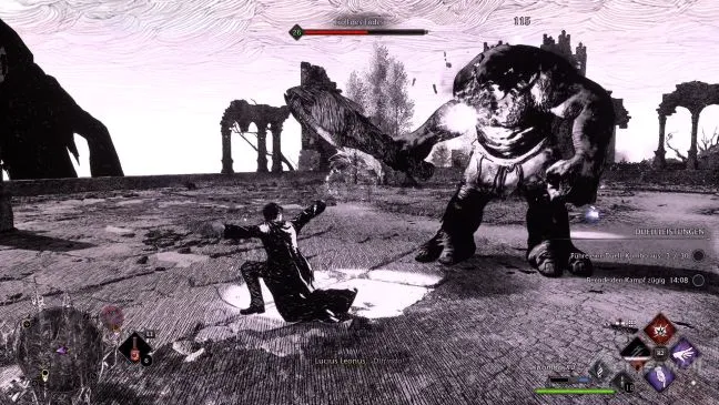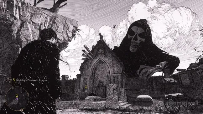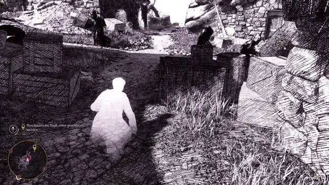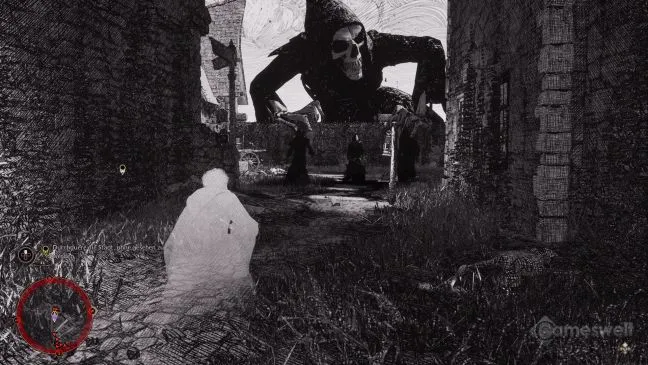 Всего в нескольких метрах находится деревня, которую атакуют странные существа. Скелеты с косами разоряют жителей. Вы ни в коем случае не должны быть обнаружены этими так называемыми смертоносными тенями, иначе на экране появится сообщение об окончании игры, и вы начнете с последней контрольной точки. Поэтому замаскируйтесь с помощью заклинания разочарования.