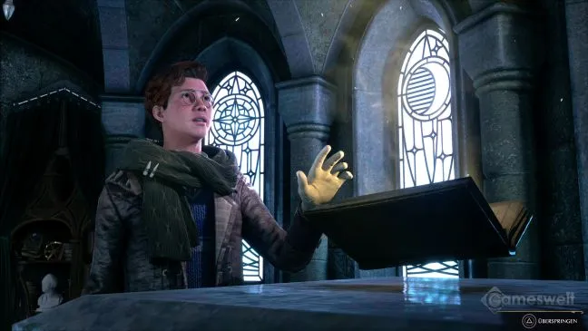 Теперь покиньте сцену, пока действие зелья не закончилось, и идите прямо в башню по большой лестнице. Наверху вы увидите большую железную горгулью, похожую на большую птицу с распростертыми крыльями. Прошепчите там пароль, чтобы получить доступ в кабинет.