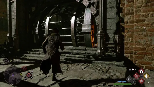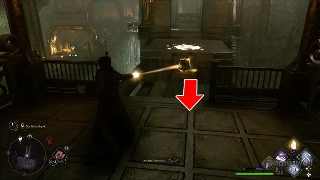 Если вы перейдете к следующей области, то сначала вам придется разобраться с несколькими гоблинами, напавшими на вас. Осмотритесь на более высоком уровне, где вы найдете деревянный ящик. С помощью Accio сбейте деревянный ящик и используйте его как приспособление для лазания. Поднимитесь на уровень выше и пройдите еще немного до запертой двери, для которой вам понадобится Алохомора 3-го уровня.