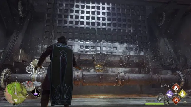 Теперь у вас есть выбор. Либо ненадолго заморозить ветряную мельницу с помощью заклинания Glacius, либо использовать Arresto Momentum. В обоих случаях эффект будет очень кратковременным. Используйте это время, чтобы с помощью Accio опустить большую деревянную заслонку над устройством ветряной мельницы. Ворота заклинит, и Нэтти сможет войти.
