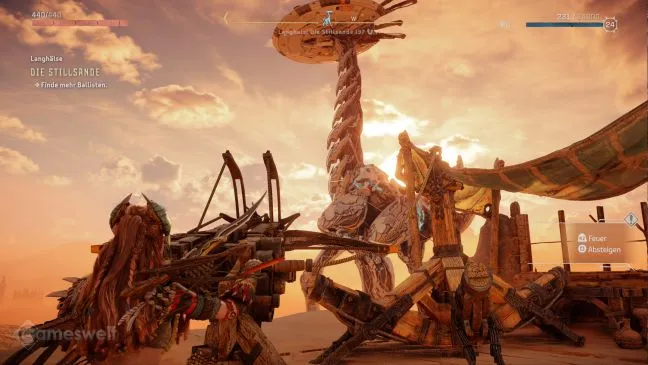 В лагере вы найдете две баллисты. Встаньте возле одной из них и выстрелите из своего огромного копья в кружащего длинношеего. Вес, который Вы на него наложите, замедлит его движение, но еще не приведет к гибели. Встревоженные атакой длинношеих, после первого выстрела к ним движутся машины. Защищайтесь.