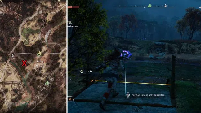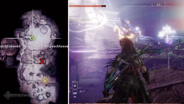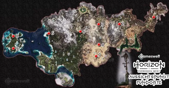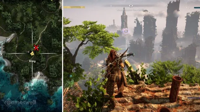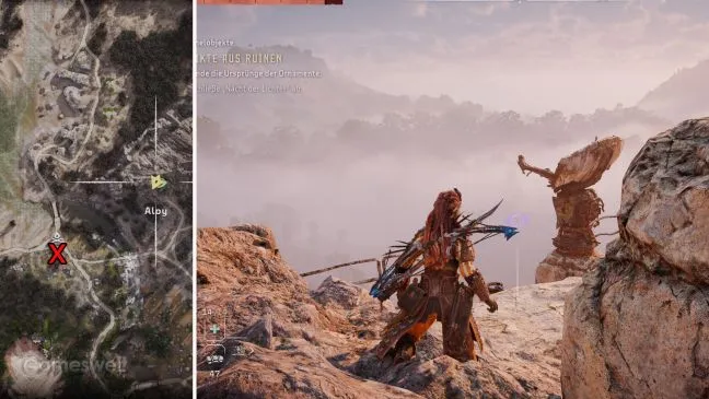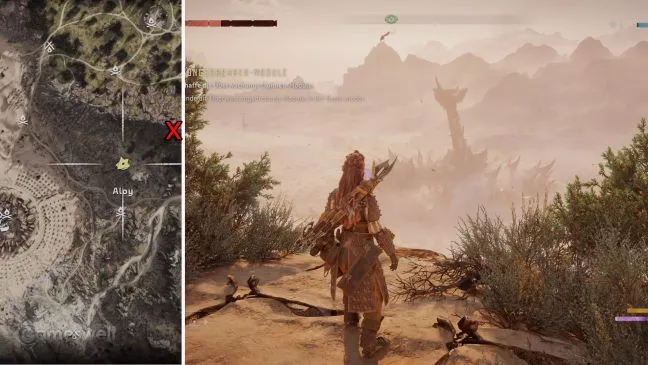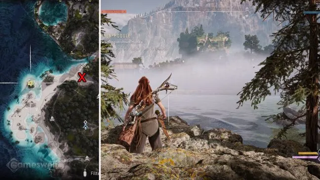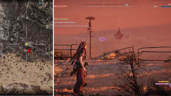 Обратите внимание: Мы стараемся, чтобы наше прохождение было как можно более компактным. Крестик на картах в наших картинках показывает, где находится башня. Место, которое вам нужно найти (включая направление взгляда), можно узнать по значку Aloy рядом с зеленым глазом, который обозначает точку обзора.