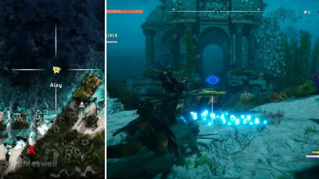Хорошей подсказкой для поиска нужного места является поиск ярко-синих водорослей на морском дне. Если вы найдете их с желтой полосой перед ними, за которую можно ухватиться и оттолкнуться, значит, вы находитесь в нужном месте. Затем посмотрите на северо-запад. В качестве дополнительной помощи используйте нашу карту.