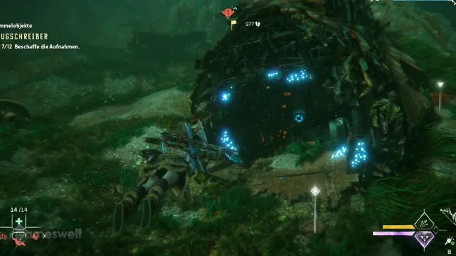 Теперь осталось добежать до конца затонувшего корабля и забрать бортовой самописец. Переходим к следующему обломку!