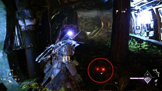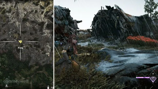 Сначала разберитесь с машинами, которые бродят здесь, - это несколько длинноногих и пара огнерогов. Затем посмотрите на восток от обломков, где в траве лежит энергоячейка. Он лежит у разбитого крыла старого самолета.