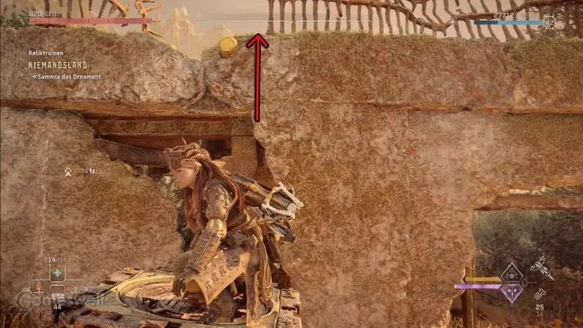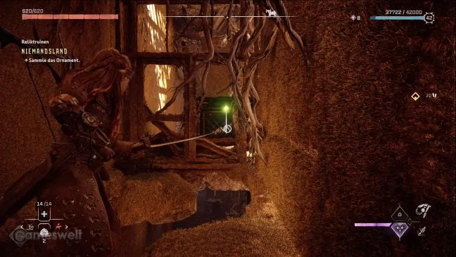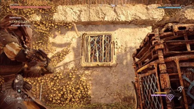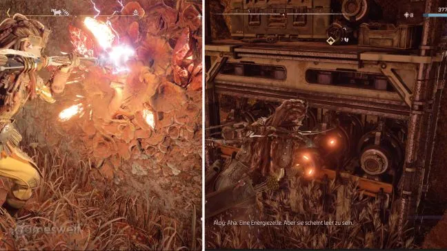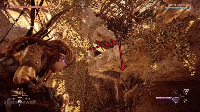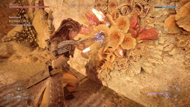 Пробегите по старой террасе на крыше налево за угол. На задней стене этого этажа вы найдете скопление грибов из огненной слюды. Пусть Алой воткнет в них свое копье, чтобы они воспламенились и пробили дыру в стене.