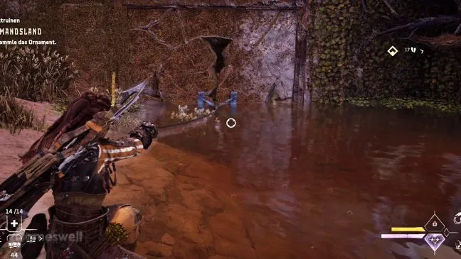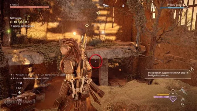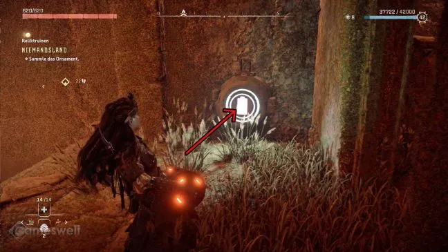 Эта руина находится в восточной части карты между городами Фахлихт и Райнкланг, но немного южнее. Как и в случае с первой руиной, для получения первых подсказок следует сначала грубо просканировать здание, поскольку фокус Алой уже может распознать некоторые устройства и двери снаружи.