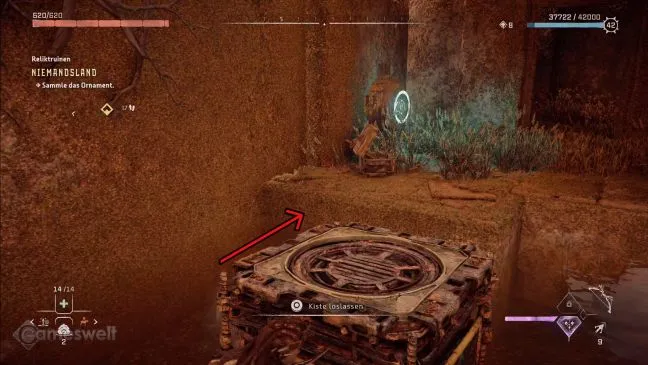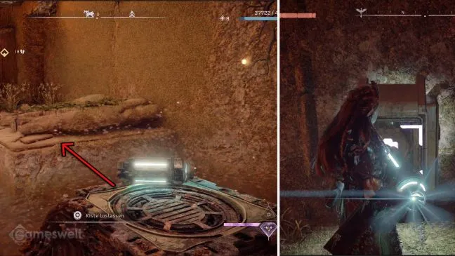 Теперь у вас есть полноценный энергетический элемент. Но вы не можете просто поднести его к двери, чтобы подпитать им дверь, потому что если вы пройдете с ячейкой по воде, она тут же разрядится. Нужно что-то для его транспортировки. Возьмите металлический ящик, но столкните его в воду (!) рядом с зарядной станцией для энергоячейки, прямо у края камня (см. наш рисунок).