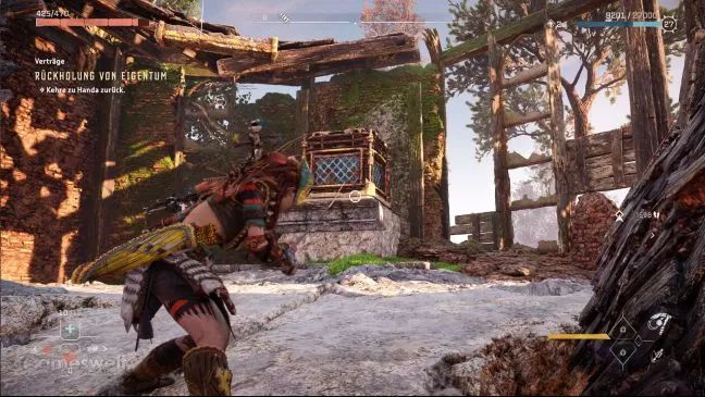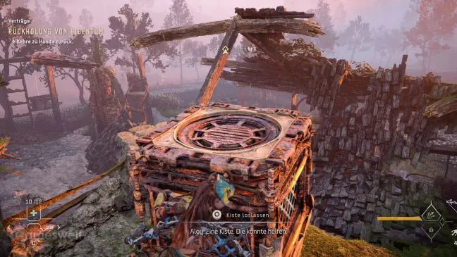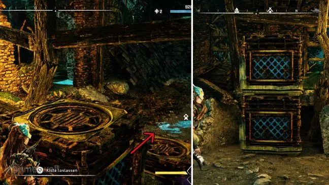 Сначала поищите на юго-востоке района ящик. Он находится на небольшом возвышении. Притяните его к земле с помощью грейферного крюка и сразу же используйте его, забравшись на него, чтобы добраться до небольшого остатка навеса. Там вы сможете разграбить ящик.