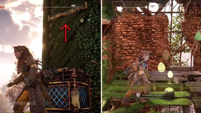 Теперь толкайте ящик вверх по склону, пока не доберетесь до боковой части церковной башни. Встаньте на ящик так, чтобы попасть на более высокие элементы лазания, и поднимитесь к украшению, которое нужно просто собрать.