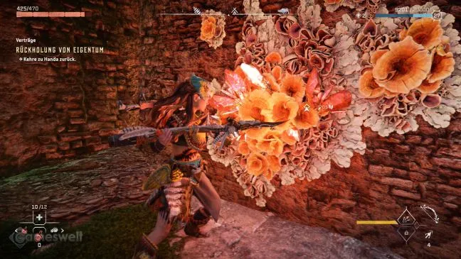 От навеса доберитесь до внешней стены колокольни, обойдите ее вокруг, используя желтые элементы. Алой обнаружит украшение внутри башни, но пока не может до него добраться. Опуститесь вниз, чтобы приземлиться во внутреннем дворе. Там на стене впереди вы найдете скопление огненной слюды. Подожгите ее, чтобы взорвать стену.