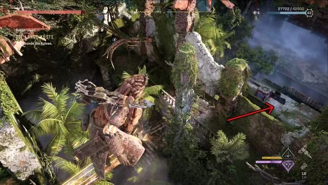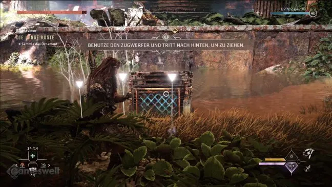 Прежде чем это произойдет, используйте захватный крюк, чтобы зацепиться за систему освещения. Алой автоматически нацелится на нее, так что вам останется только подпрыгнуть и нажать кнопку "квадрат". Если вы упустили момент, нужно снова потянуть за рычаг и повторить попытку.