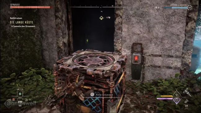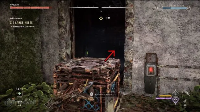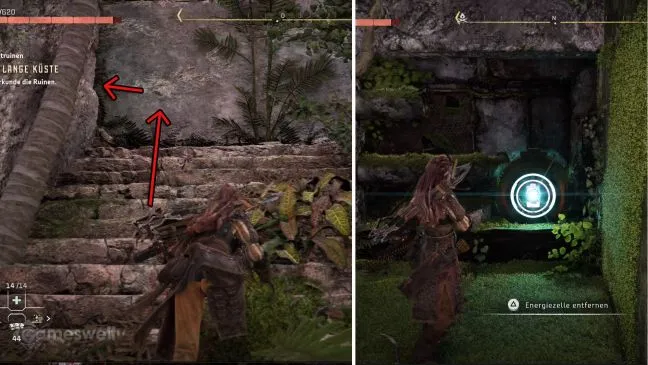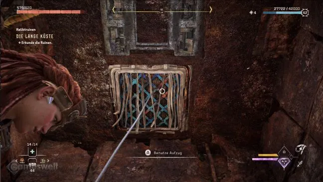 Спуститесь по лестнице с энергетической ячейкой. Слева вы найдете розетку для него. Оно относится к лифту. Если вставить энергетический элемент в гнездо, лифт снова будет готов к работе.