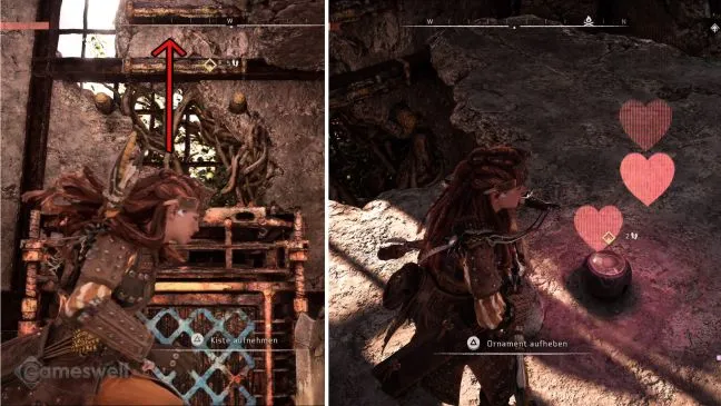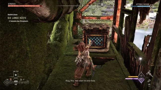 Прикрепившись к светильнику, не ждите, пока он снова начнет двигаться. Немедленно спрыгните с него еще раз, чтобы Алой приземлился на пешеходный мост, расположенный за ним. Там вы найдете второй нужный вам металлический ящик. Возьмите его и столкните на землю.