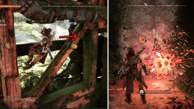 Проберитесь вправо по уступам. В правом конце этого участка спуститесь в отверстие. Повернитесь к стене и взорвите грибы из огненной слюды, которые вы видите на стене.