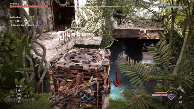 Теперь дотащите ящик до подъемника. Сначала столкните его в бассейн с водой, а затем вытащите его из воды с другой стороны с помощью захватного крюка.