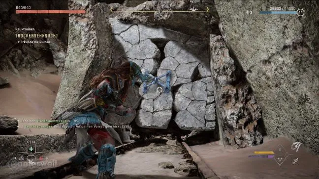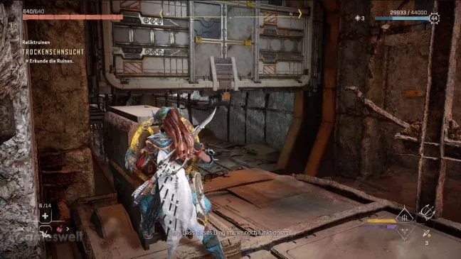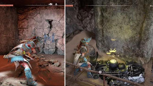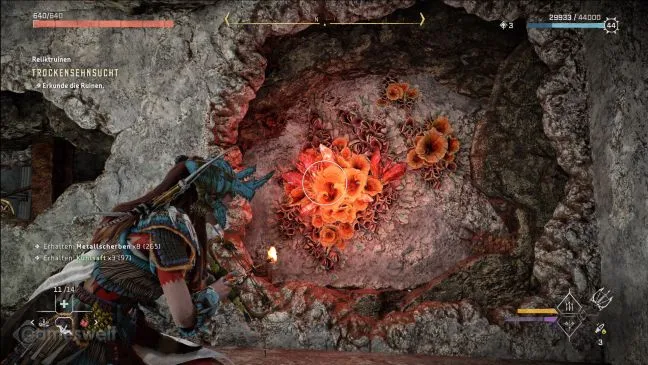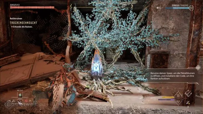Войдите в развалины через щель. Искомое украшение уже видно отсюда. Он находится справа на более высокой платформе. Ваша первая цель - металлический цветок, выпускающий ряд усиков. Ударьте по нему лозорезом, чтобы усики исчезли и открылся проход в стене.