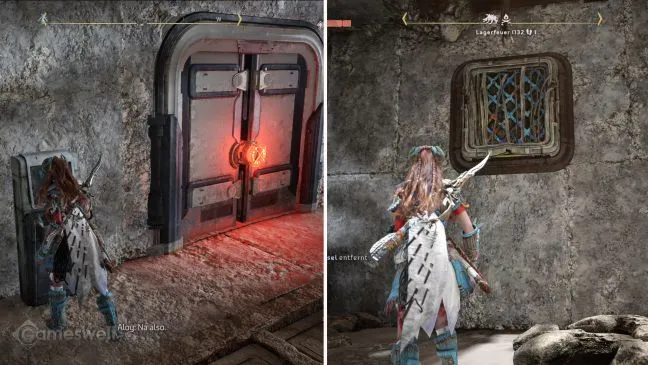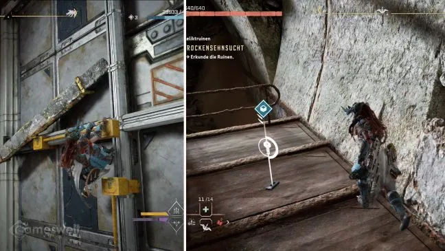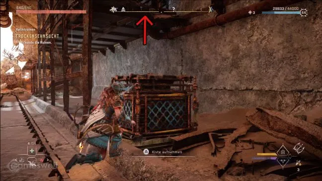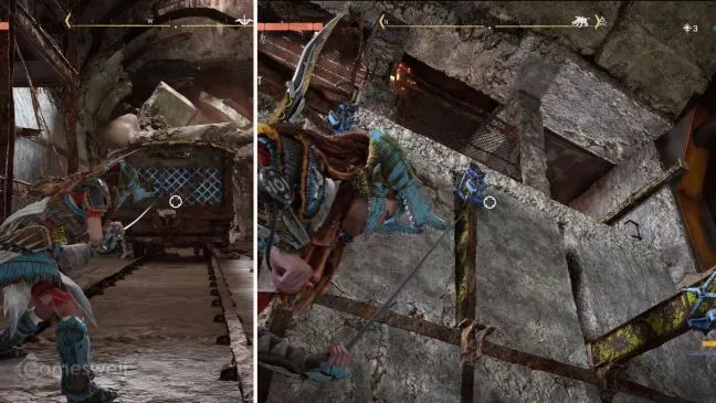 Поскольку противопожарная дверь больше не опускается до конца, элементы для лазания с другой стороны также находятся выше. Заберитесь на тележку в задней комнате и с тележки поднимитесь по элементам противопожарной двери, чтобы спрыгнуть на выемку наверху.