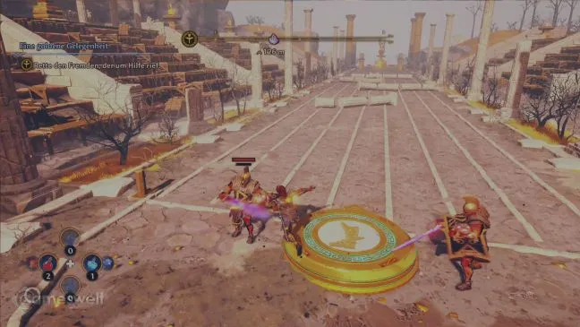 Вы победили обоих солдат? Отлично! Если вы теперь встанете на переключатель на полу, начнется испытание в категории "Гонка на время". Посмотрите на землю перед собой. Маленькая стрелка рядом с напольным переключателем подскажет, в каком направлении нужно бежать. Однако забег начнется только после того, как вы отойдете от выключателя. Сразу же после этого вдали появится столб света. Вы должны добраться до него до того, как закончится фоновая музыка. Для этого необходимо быстро бежать (т.е. удерживать кнопку бега нажатой во время движения - кнопка X на Xbox, квадрат на PlayStation, кнопка Y на Switch). Прыжками старайтесь избегать всех препятствий. Если вы доберетесь до финиша за отведенное время, в воздухе появится золотой столбик времени, Феникс дотянется до него и достанет несколько монет Charons. Монеты можно будет обменять на улучшенные навыки позже в игре.