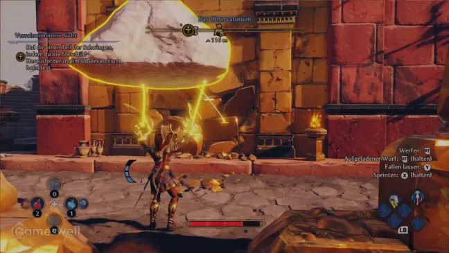 Теперь вы можете опробовать крылья: выпрыгните из обсерватории, нажмите вперед на аналоговом стике и кратковременно нажмите кнопку функции планера (кнопка B на Xbox. Circle на PlayStation, кнопка A на Switch). Пока у вас есть запас выносливости, вы можете плавно скользить в одном направлении. Если у вас закончится выносливость, Fenyx потерпит крушение. Однако во время скольжения можно съесть гриб (или позже синее зелье), чтобы восполнить запас выносливости.