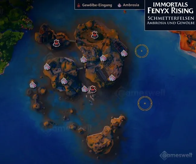 Все валуны с амброзией на этом участке легко найти. В старой деревне следует искать в разрушенных башнях, остальные очевидны, если только они не находятся под водой.