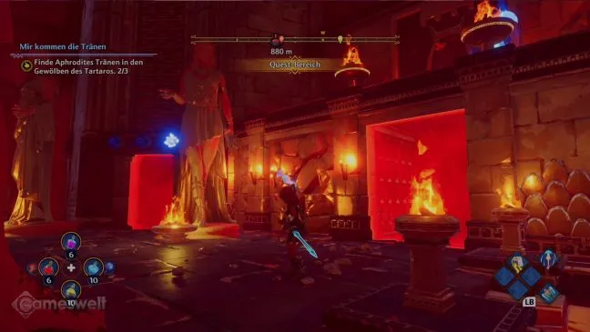 Сундук с сокровищами также находится на полпути к цели, прямо перед алтарем со слезой, но сундук стоит на очень высоком столбе. Вместо того чтобы использовать божественную силу "Гнев Ареса", можно просто дойти до конца хранилища и прямо перед финишной точкой, где ждет молния Зевса, прыгнуть вниз с левой стороны, чтобы доплыть до сундука. Это заставит вас проделать обратный путь к цели, но займет всего две минуты.