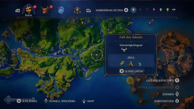 Первым пунктом назначения является хранилище Тартара под названием "Падение Адониса". Оно расположено на самом юге Долины Вечной Весны в лесном массиве, см. наш скриншот.