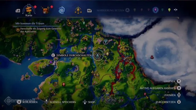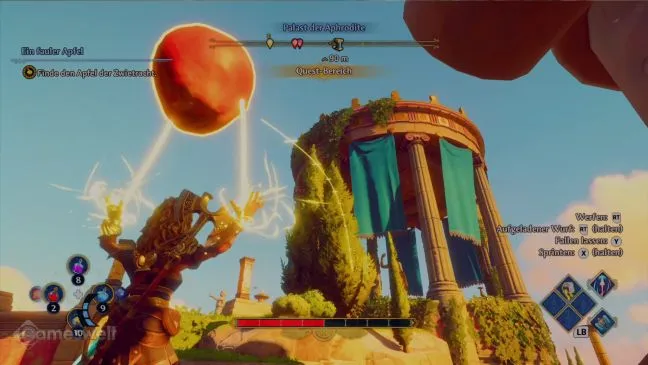 Затем найдите знаменитое Яблоко Раздора. Оно находится во дворце Афродиты. Местонахождение дворца обозначено на карте символом яблока. Он находится на крайнем западе Долины вечной весны в укромном уголке местности. Активируйте соответствующий символ на карте, чтобы он также отображался на панели компаса. Таким образом, вы не заблудитесь.