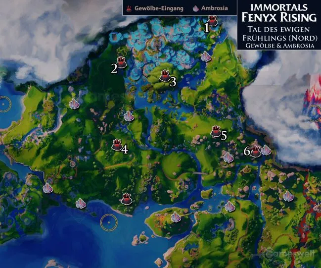 Следующие хранилища расположены на севере Долины Вечной Весны. Некоторые перечисленные локации амброзии и хранилища пересекаются на северном и южном изображениях.
