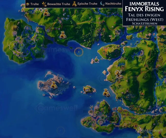 На западе Долины Весны нет сундуков, требующих особого объяснения. Единственный, который еще не был указан на других картинках, - это сундук на Каменном острове, который охраняет легендарный зверь.